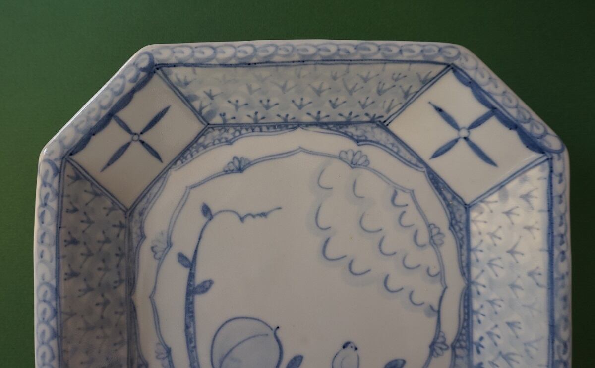 稲村真耶さんの染付隅切皿(桃と鳥と)